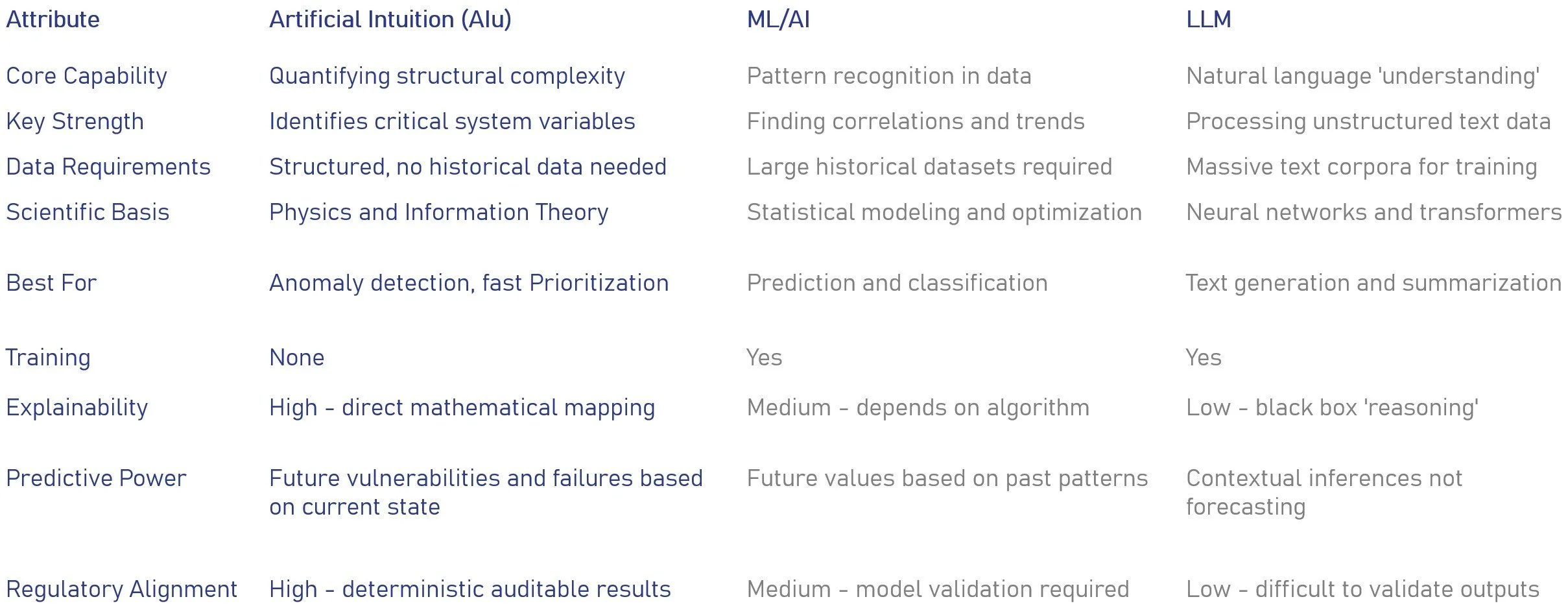 A quick comparison between Artificial Intuition and AI and LLMs is provided below.
